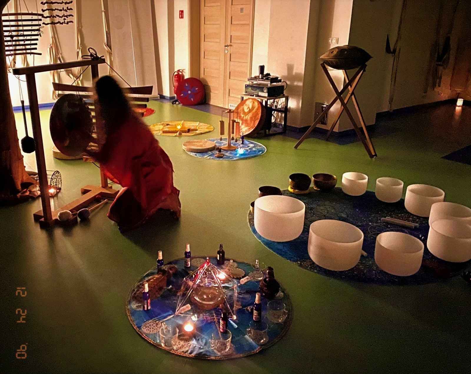 - taneční akci (Ecstatic dance) se zvukovou koupelí ke konci - většinou se upravuje a zazní jen křišťálové mísy, gong a/nebo handpan